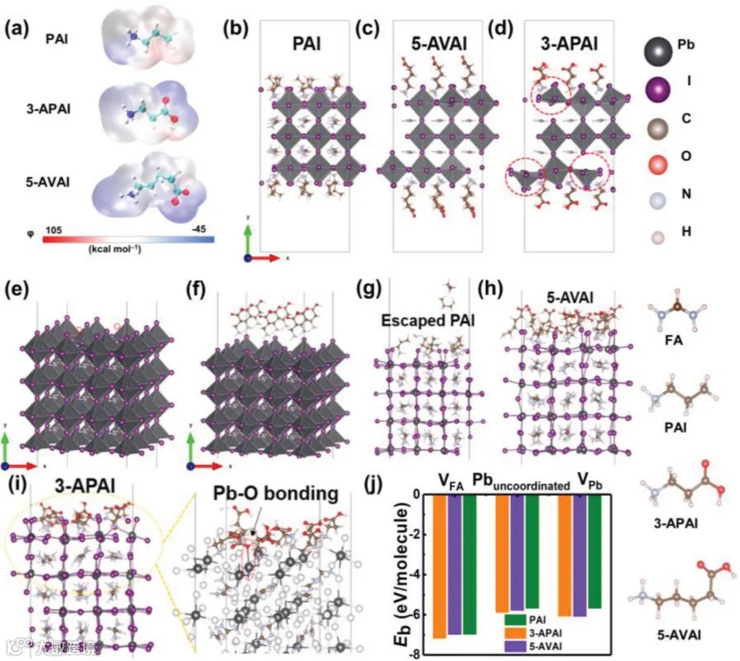计算结果(图1j)显示,3-APAI分子与不同类型缺陷的结合能最大,表明其对缺陷的修饰效果最佳。