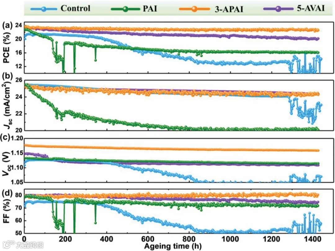 结果显示,3-APAI处理设备在整个测试过程中保持最高的转换效率(图7a)、短路电流密度(图7b)和开路电压(图7c),仅填充因子略低于5-AVAI处理设备(图7d)。