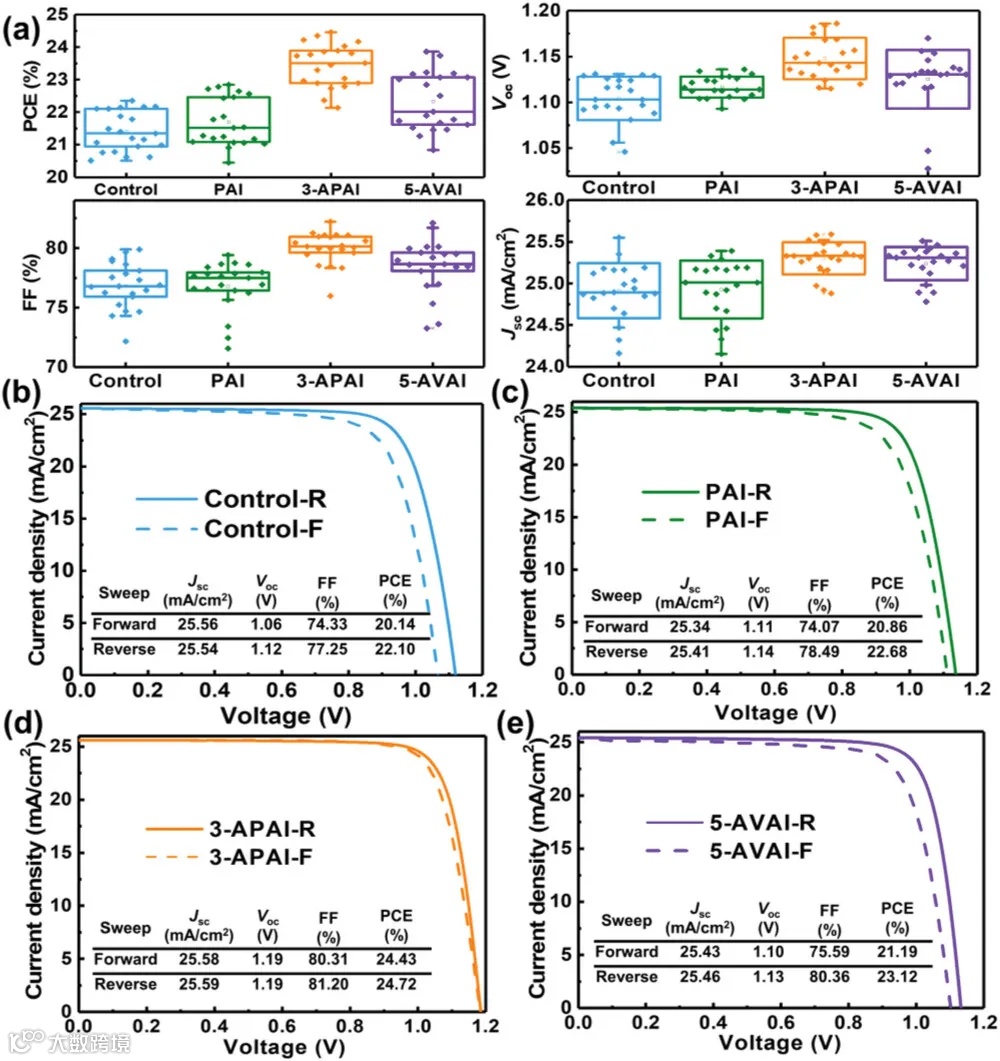 图6b-e给出了各组件中性能最佳的单个J-V曲线,与统计结果一致。其中,3-APAI改性设备(图6d)具有最高的Voc(1.17V)和Jsc(23.5mA/cm2),FF值也最高(0.79),表明其光伏性能最优。