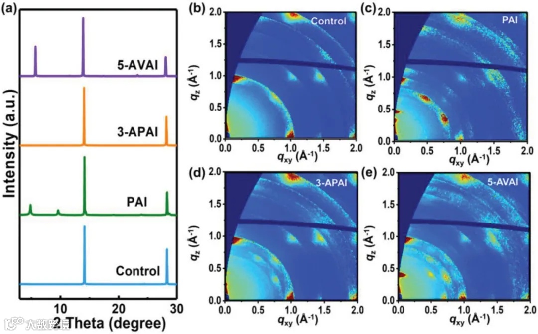 图2b-e显示了GIWAXS结果,进一步证实了XRD结果:PAI(图2c)和5-AVAI(图2e)处理后形成了2D铅碘钠,而3-APAI(图2d)处理后未形成2D铅碘钠。