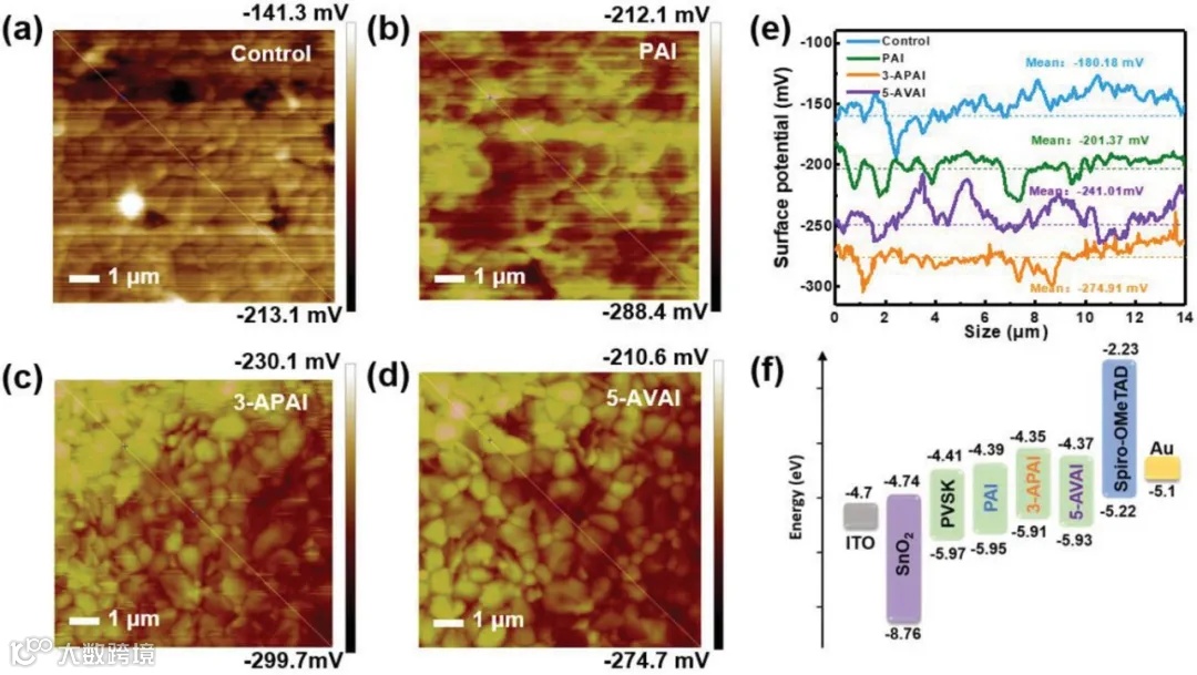 图3a-d显示了对照样品和用PAI、3-APAI、5-AVAI处理后的掺杂铅碘钠薄膜的KPFM结果。