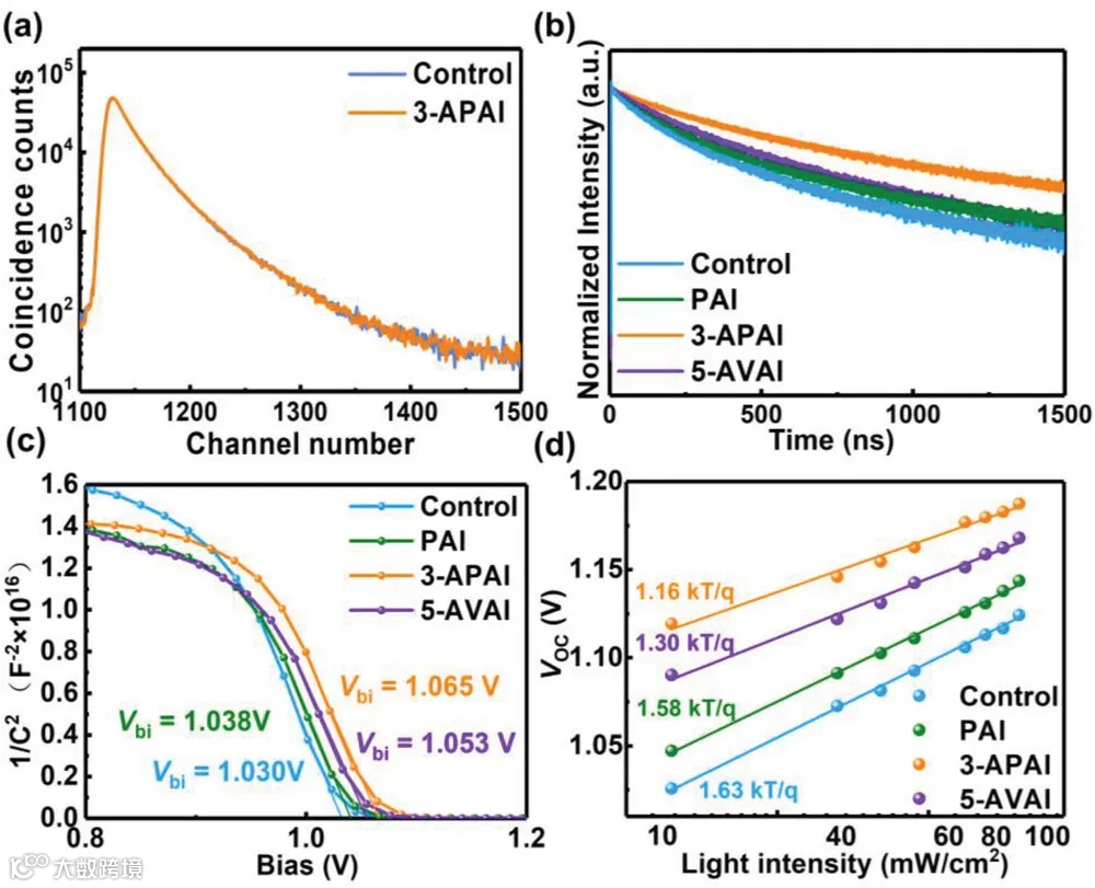 总之,正电子寿命、时间分辨荧光和Mott-Schottky结果一致证实,3-APAI处理能有效修饰界面缺陷,从而实现开路电压的提升和稳定性改善。