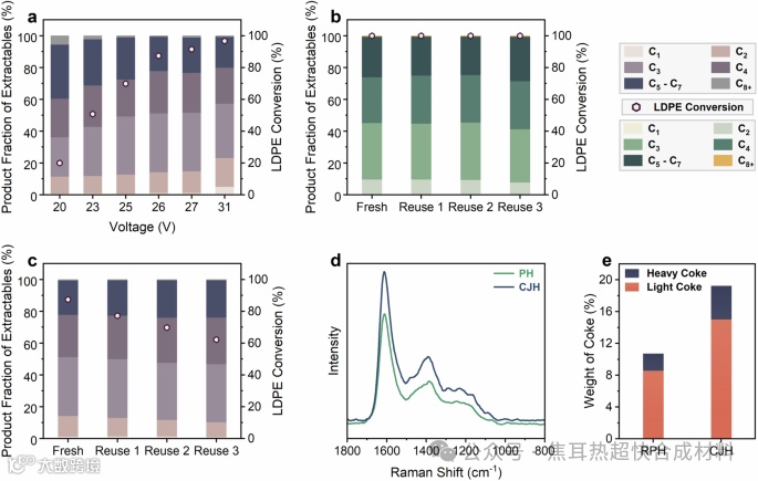 在实验过程中,研究人员优化了反应参数,如图2所示,包括直流电压、脉冲数量、聚合物与催化剂的比例以及氦气流量,以实现最佳的单体转化率和产物分布。实验结果表明,通过调节这些参数,能够显著提高轻质烯烃的产率和选择性。此外,研究人员还发现脉冲操作和蒸汽共给能够显著提高解构的选择性,并减少催化剂的积碳,从而降低了催化剂的失活速率。