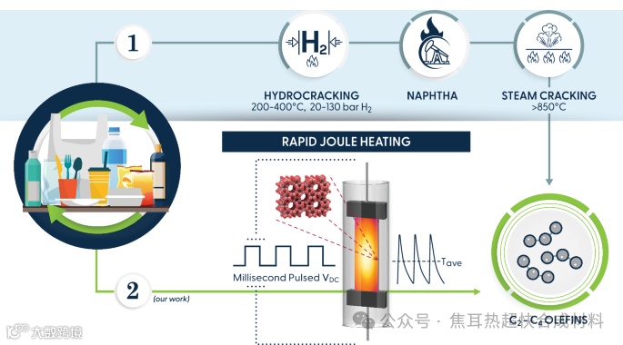 图 1: 将聚烯烃转化为单体的化学路径。路径1包括在高压氢气条件下对塑料进行加氢裂化,以产生石脑油,然后通过高温蒸汽裂解转化为 C2–C4 烯烃。路径2展示了通过快速脉冲或连续焦耳加热在 H-ZSM-5 催化剂上直接转化聚烯烃的方法。