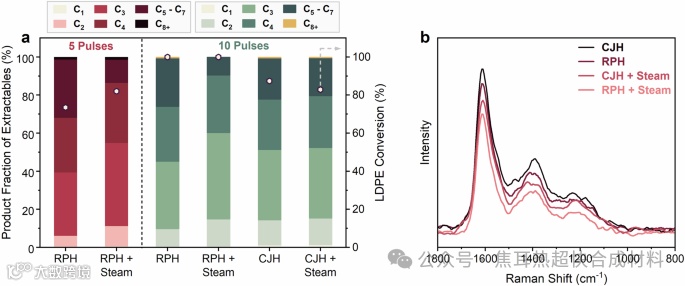 在比较连续焦耳加热(Continuous Joule Heating, CJH)与快速脉冲焦耳加热(RPH)的效果时,如图4所示,研究人员发现尽管CJH在轻质烯烃产率上略有优势,但RPH在催化剂的可重复使用性方面表现更佳。此外,研究人员还发现共给蒸汽能够进一步提高轻质烯烃的产率并减少积碳,如图5所示。