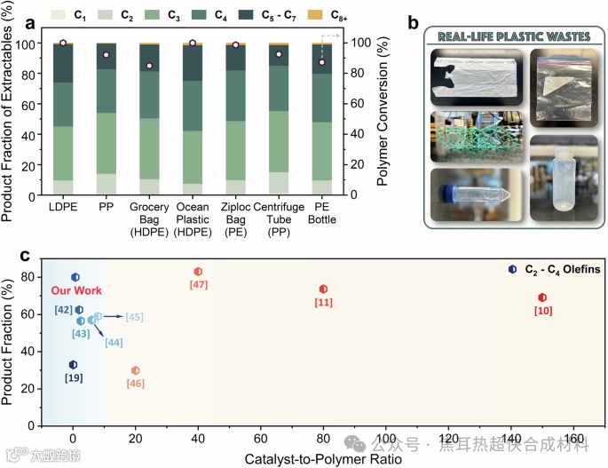 最后,研究人员还验证了RPH技术对各种实际塑料废物的解构能力,如图6所示,包括不同来源的聚乙烯和聚丙烯材料,以及含有添加剂和杂质的实际塑料。这些结果证明了RPH技术的普适性和对实际应用的适应性。通过这些系统的实验和分析,本研究为聚烯烃塑料废物的电化学回收提供了一种高效、环保的新途径。
