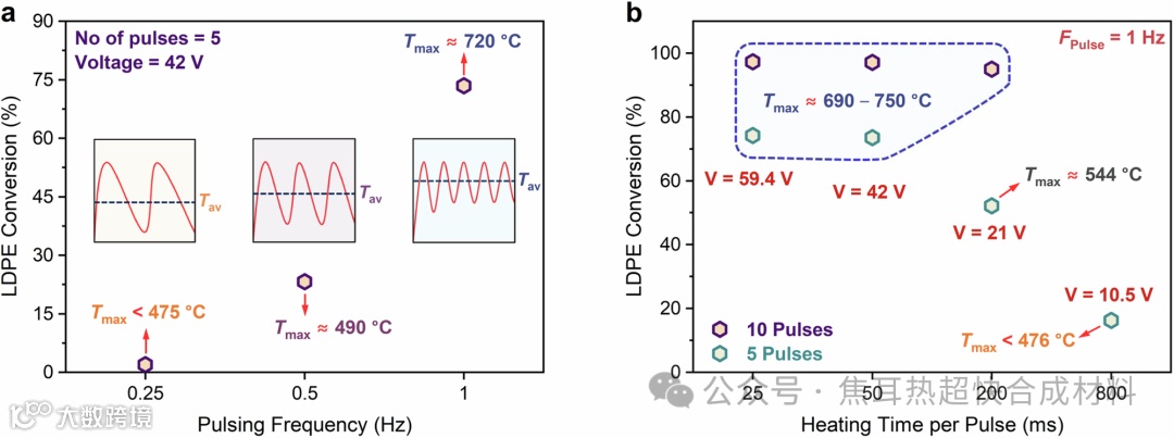 图3进一步探讨了脉冲参数对解构效率的影响,包括脉冲频率和加热时间。这些发现为实现更高效、更环保的聚烯烃塑料回收提供了重要的指导。