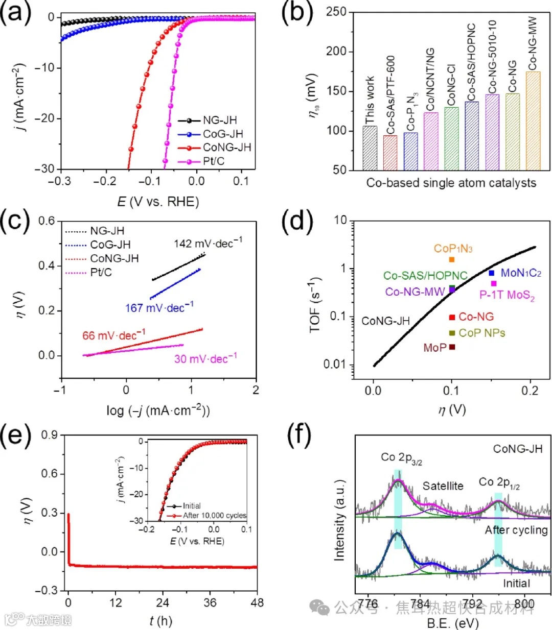 图4展示了CoNG-JH在0.5 M H2SO4电解液中的HER电催化性能,包括极化曲线、塔菲尔斜率、周转频率(TOF)和长期稳定性测试。CoNG-JH表现出低过电位、小塔菲尔斜率和优异的长期稳定性,这些结果与对照样品相比,凸显了原子级分散CoNx活性位点在提升催化性能中的关键作用。