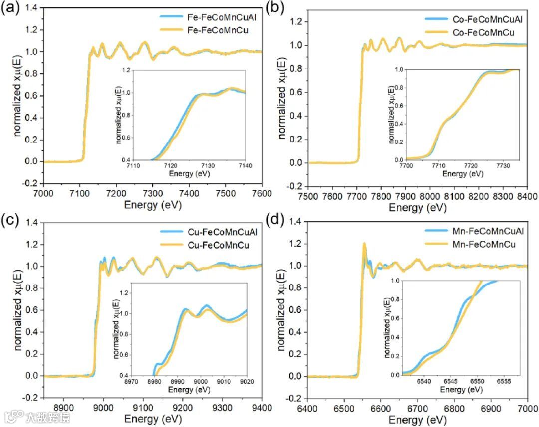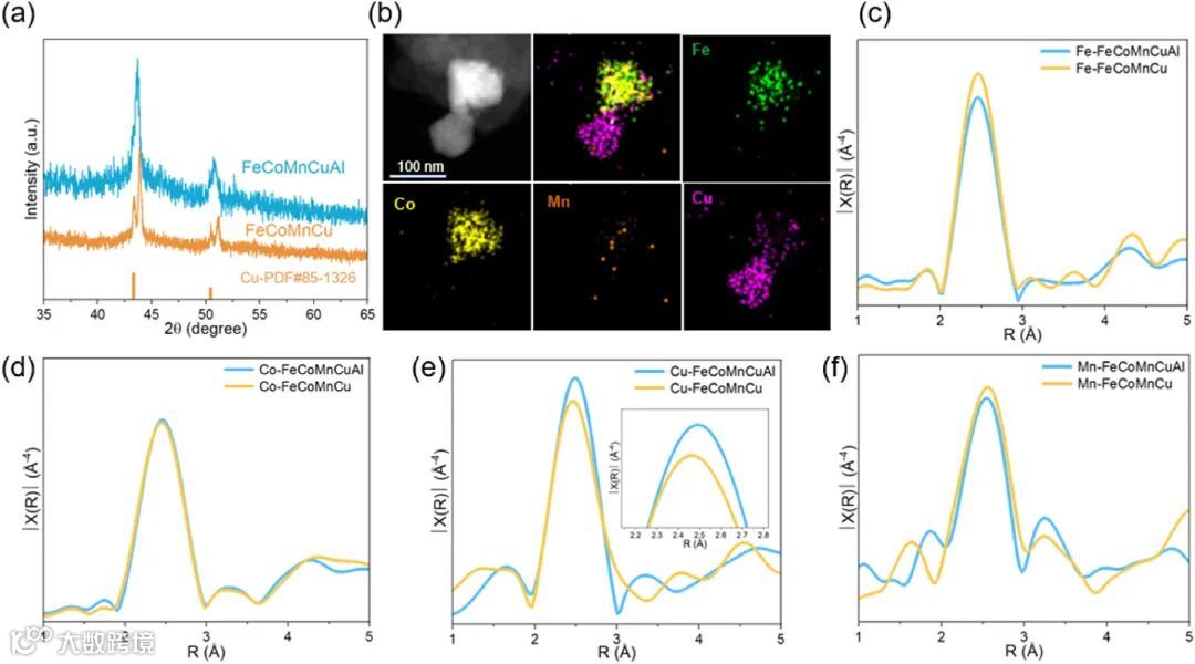 图 3 通过 X 射线吸收近边结构(XANES)和扩展 X 射线吸收精细结构(EXAFS)技术,对 FeCoMnCuAl 和 FeCoMnCu 催化剂中的元素氧化态进行了深入分析。结果表明,Al 的引入显著降低了 Fe、Cu 和 Mn 的氧化态,有效防止内部元素的氧化。