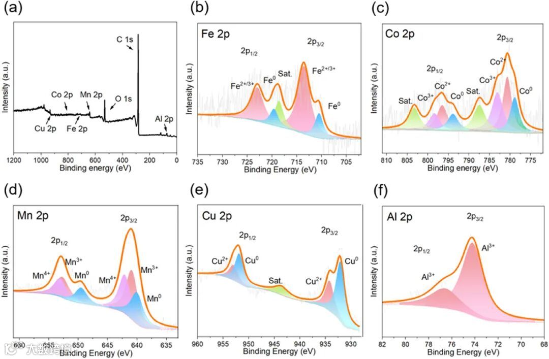 图 2 中的 XPS 分析确认了 Fe、Co、Mn、Cu 和 Al 的元素存在,并揭示了多价态高熵结构对电催化活性的提升作用。