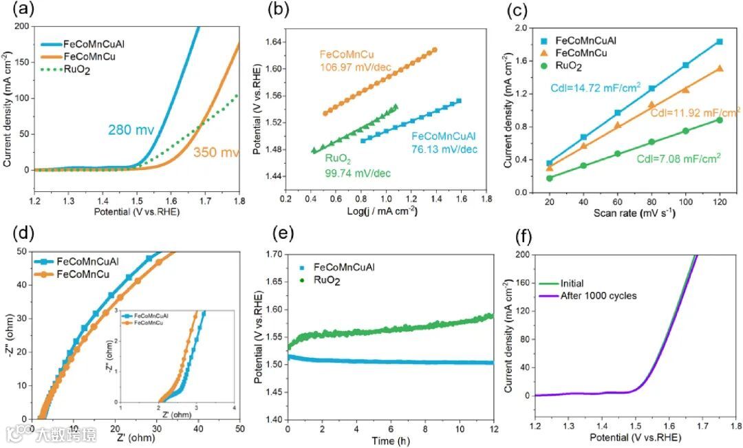 图 4 显示 FeCoMnCuAl 纳米颗粒在 OER 应用中的表现,具有低过电位、高双电层电容以及更高的电化学稳定性。