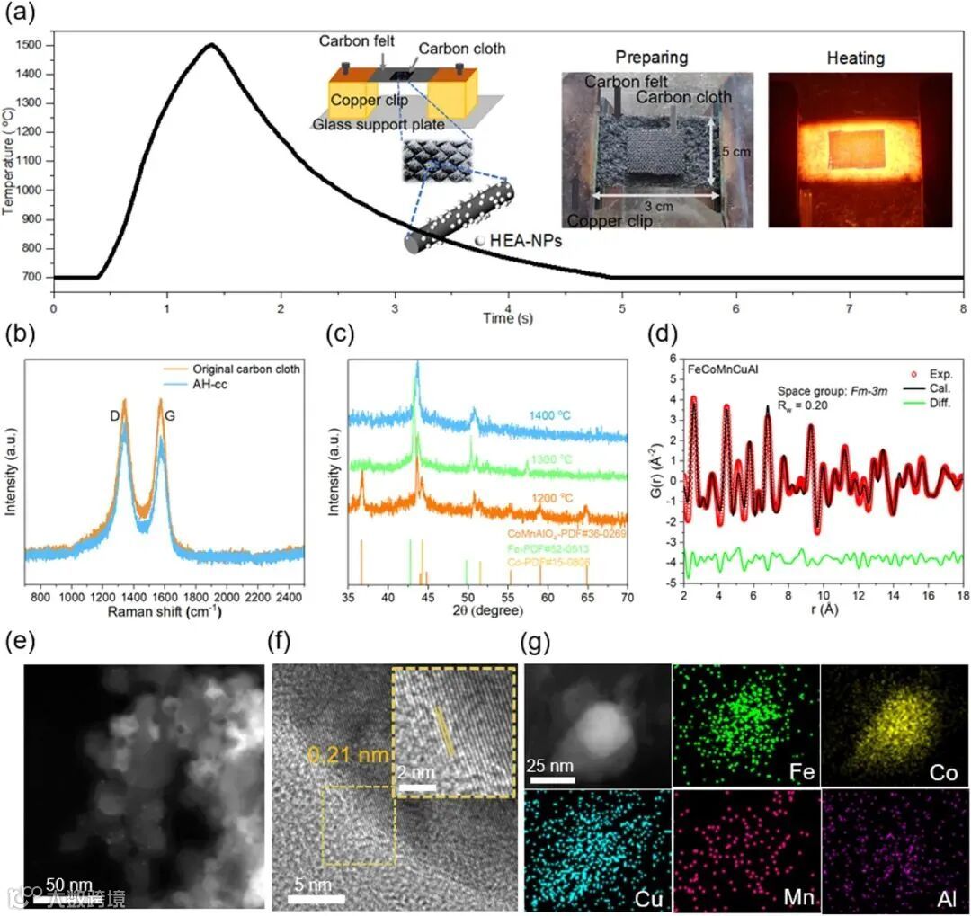 图 1 展示了高温冲击合成过程的温度曲线和关键步骤示意图,显示了 HTS 工艺在 1400°C 高温下实现的快速加热与冷却过程。此过程确保了碳布表面生成缺陷结构,有助于纳米颗粒的均匀分布。