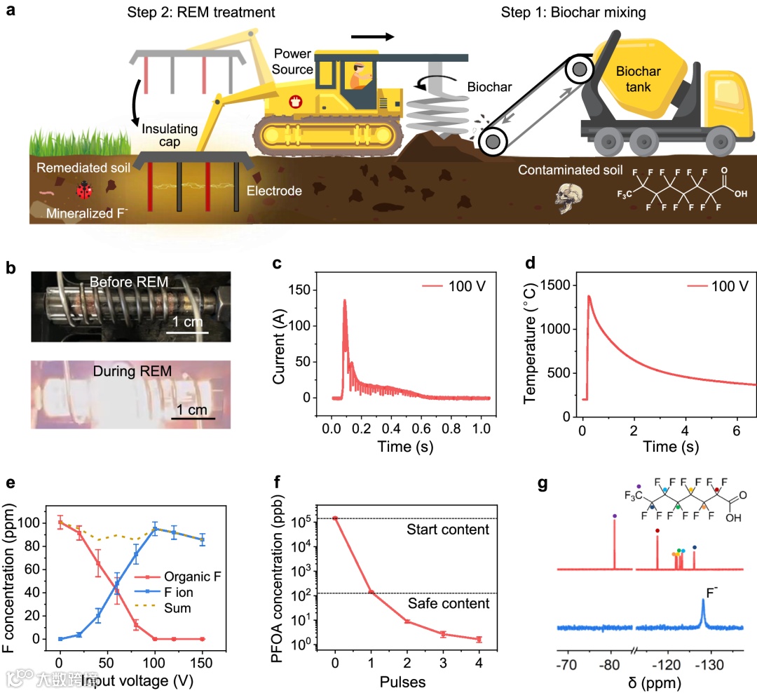 在本研究中,研究人员开发了一种创新的快速电热矿化(REM)技术,用于有效修复全氟和多氟烷基化合物(PFAS)污染的土壤。利用环境相容性好的生物炭作为导电添加剂,通过直流脉冲输入,能在数秒内将受污染土壤的温度迅速提升至超过1000°C,实现PFAS的矿化,转化为天然存在且无毒的氟化钙(CaF2)。图1展示了REM处理PFOA污染土壤的全过程,包括概念设计、实验样例、电流和温度曲线,以及PFOA含量和19F NMR谱图的变化。