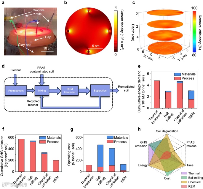 研究进一步展示了REM技术的普适性,证明了它不仅适用于PFOA,还适用于包括PFOS、PFHxS和PFBS在内的其他PFAS。此外,REM技术在处理公斤级土壤时显示出了高效率和均匀性,表明了其在大规模、现场土壤修复方面的应用潜力。生命周期评估和经济技术分析显示,与传统的土壤修复方法相比,REM技术在能耗、温室气体排放、水资源消耗和运营成本方面都有显著降低,是一种环境友好且经济的修复方法。这些结果不仅证实了REM技术的高效性和环境效益,还展示了其在实际应用中的巨大潜力。未来的研究可以进一步优化REM技术,探索其在不同类型土壤和污染物中的应用,并推动其商业化进程。