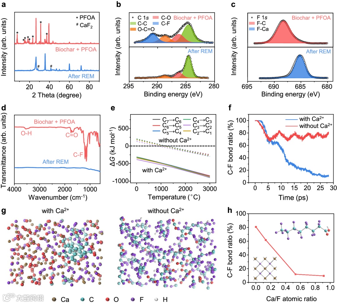 此外,REM技术还成功应用于处理含氟聚合物,如聚四氟乙烯(PTFE),实现了约95%的高矿化比率。图3进一步探讨了PFAS矿化过程中钙离子的作用机制,通过XRD、XPS、IR光谱分析和理论计算,揭示了钙离子在PFAS矿化过程中的关键作用。