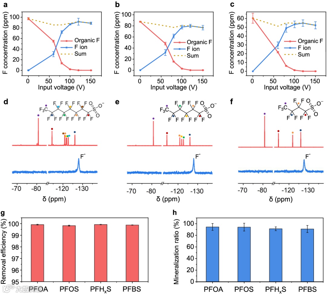 为了证明REM技术的普适性,研究人员不仅对PFOA进行了研究,还对PFOS、PFHxS和PFBS等其他PFAS进行了矿化行为研究。图2展示了不同PFAS的矿化效率和矿化比率,以及19F NMR谱图的变化,证实了REM技术对各种PFAS的有效去除。