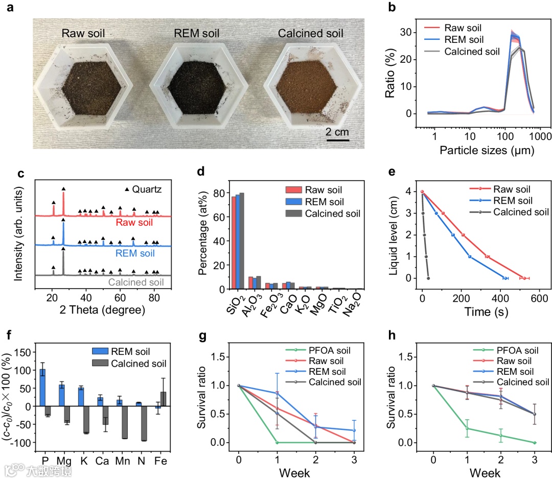 REM技术的关键在于利用土壤和生物炭中固有的高钙含量,在封闭系统中进行处理,几乎不产生有害的氟碳气体排放。实验结果表明,REM技术对各种PFAS实现了超过99%的高去除效率和超过90%的矿化比率,证明了其广泛的适用性。此外,REM技术在增加处理后土壤中可交换养分供应的同时,保持了土壤颗粒大小、组成和水分渗透率,避免了耗时且严重降低土壤性质的传统煅烧方法。