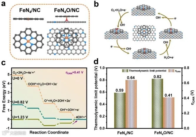 图4 通过理论计算,直观揭示了轴向氧配位对反应能垒的降低作用,以及其对活性中心电子分布的优化效果。