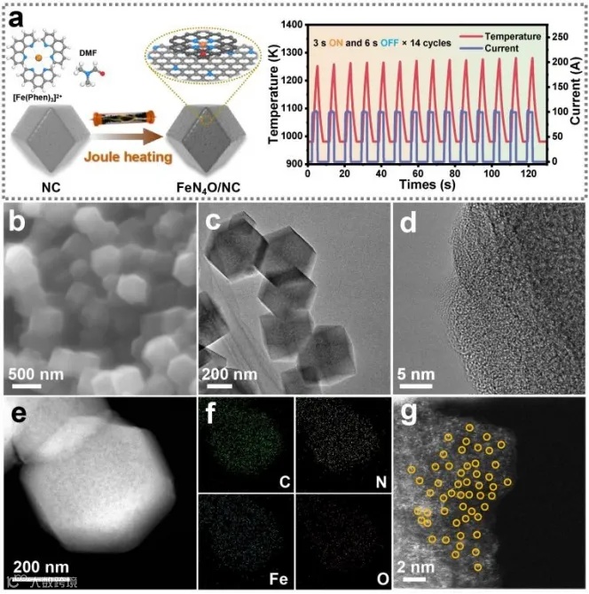 使用超快焦耳加热技术,通过高温快速升温与精确控制,制备出具有轴向氧配位特性的FeN4O/NC催化剂。 -