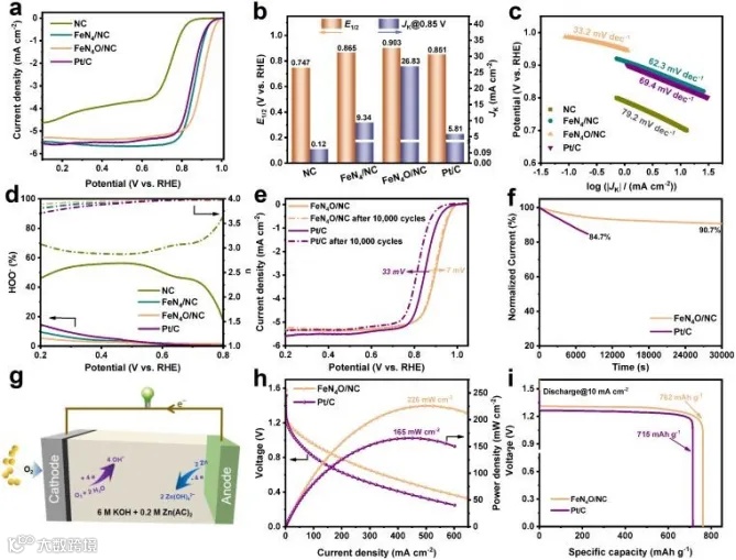实验结果显示,FeN4O/NC催化剂的半波电位(E1/2)达到0.903 V,性能超越商业Pt/C,并在长期循环中保持了较低的衰减率。 -