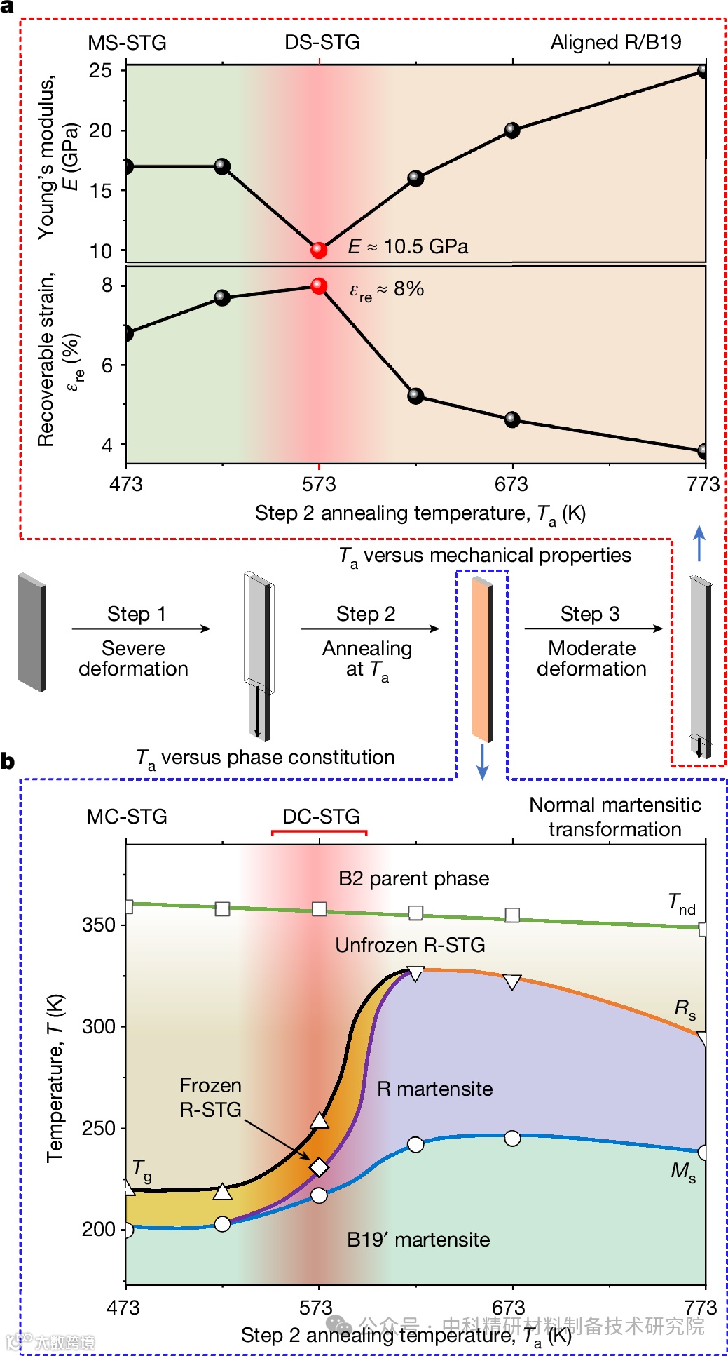 西安交通大学的研究团队,经过多年的探索,通过简单的三步热机械处理,成功制备出“双核应变玻璃”合金(DS-STG)。这一新材料具备钢样的屈服强度(σy ≈ 1.8 GPa),却保留了聚合物般的低杨氏模量(E ≈ 10.5 GPa),并展示出约8%的弹性应变。这意味着,DS-STG不仅在极端条件下保持了其超高强度,还能像橡胶一样在大应变下保持良好的恢复性。