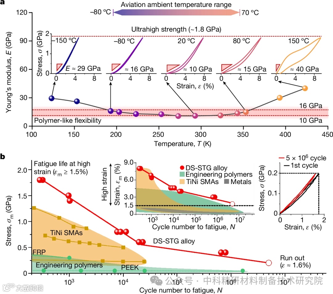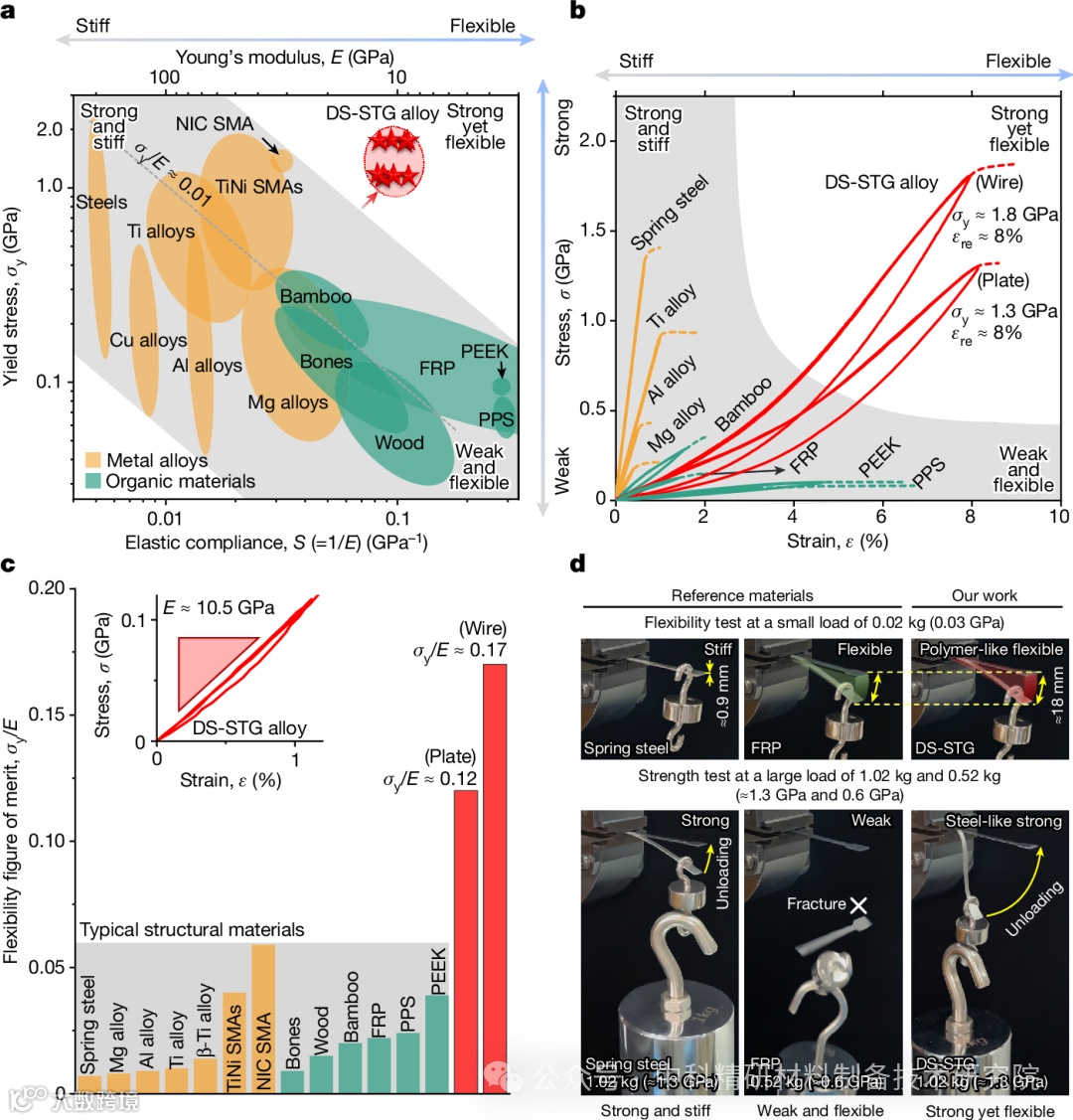 图1:将DS-STG合金与常见金属和有机材料进行对比,展示其独特的强度和柔韧性结合。