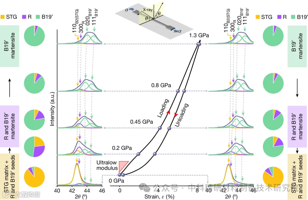 图4:通过XRD原位分析揭示DS-STG合金的J形弹性特性来源。