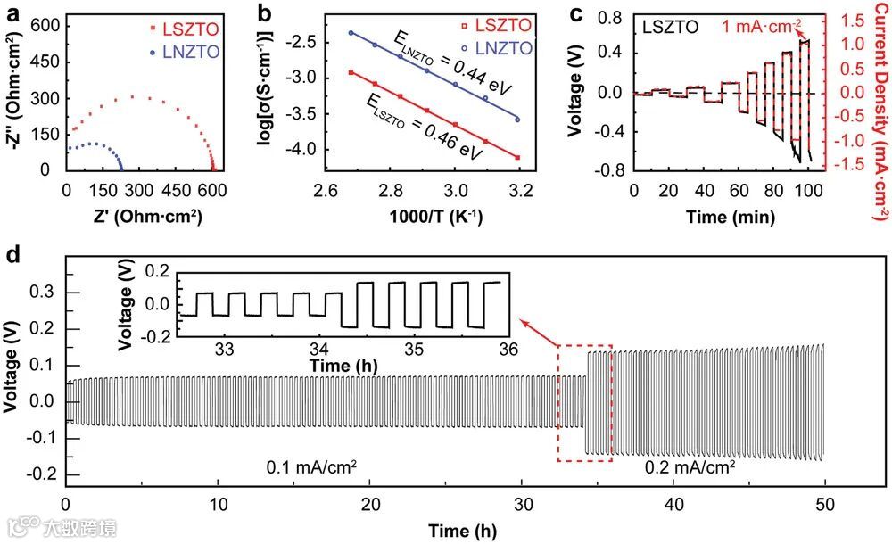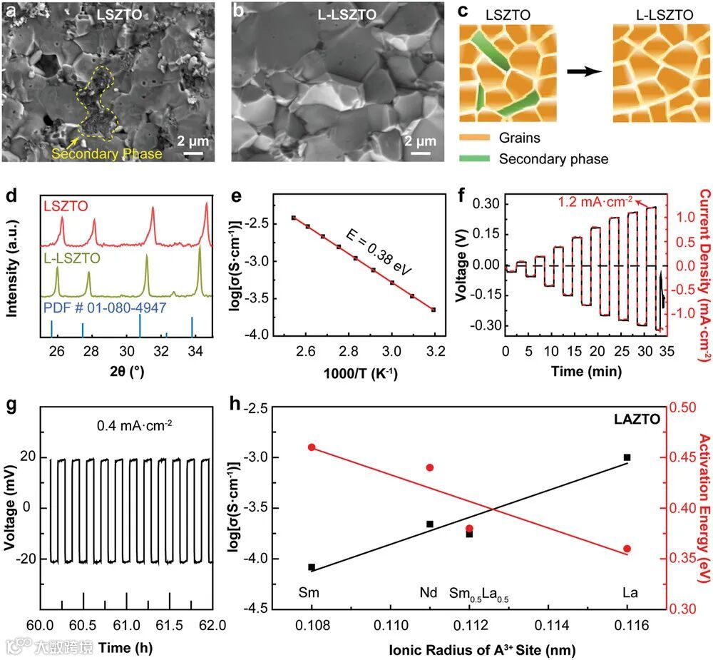 2020年,马里兰大学的胡良兵教授和莫一飞教授等人在《Advanced Materials》上发表了题为“Computation-Guided Synthesis of New Garnet-Type Solid-State Electrolytes via an Ultrafast Sintering Technique”的论文。本研究中,通过超快速烧结技术,成功合成了计算预测的具有理想材料特性的SSEs。利用密度泛函理论筛选出三种新型石榴石型锂离子导体:Li6.5Nd3Zr1.5Ta0.5O12(LNZTO)、Li6.5Sm3Zr1.5Ta0.5O12(LSZTO)和Li6.5(Sm0.5La0.5)3Zr1.5Ta0.5O12(L-LSZTO),它们展现出良好的合成能力和稳定性。通过焦耳加热的超快速烧结方法,将烧结时间从数小时缩短至不足25秒,有效减少了锂的损失,并促进了晶粒的融合,提高了材料质量。实验结果与计算预测一致,LNZTO展现出最佳的合成能力和相稳定性,其离子导电性在三种新型SSEs中最高,达到2.3 × 10^−4 S cm^−1。在0.2 mA cm^−2的电流密度下,Li/LNZTO/Li对称电池能够稳定循环约90小时而没有明显的过电位增加。本研究成功展示了超快速烧结技术在实现计算预测并快速优化筛选高性能SSEs方面的应用潜力。