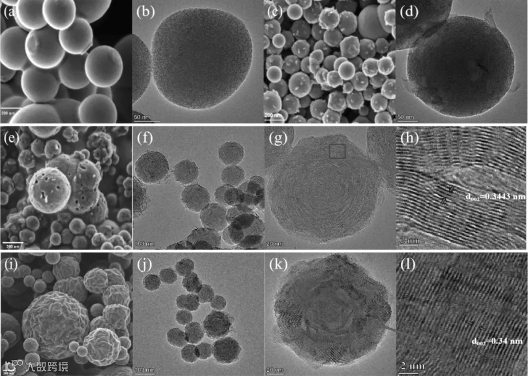 显微镜图像展示了碳黑颗粒的形貌演变,缺陷修复后形成有利于电化学性能的多孔结构。