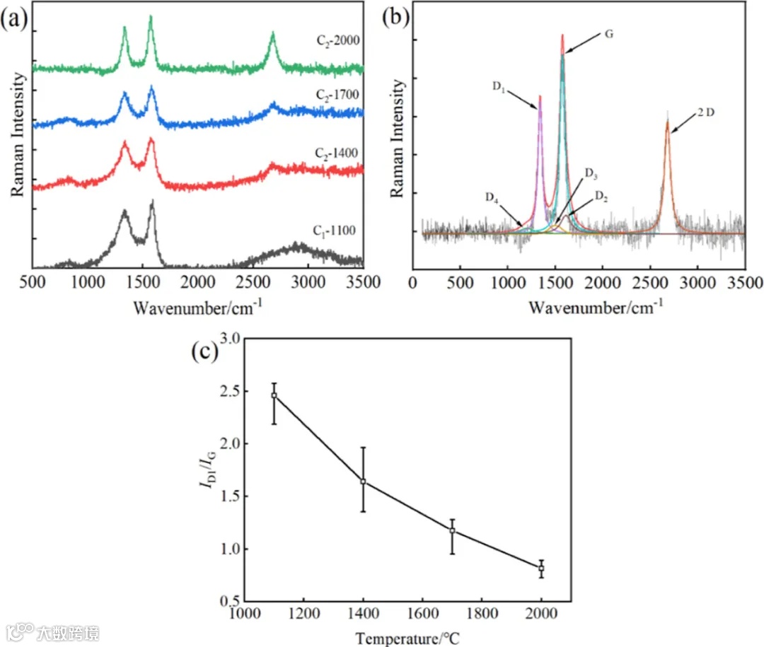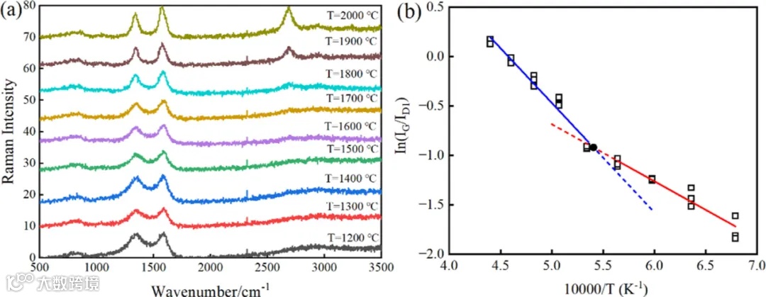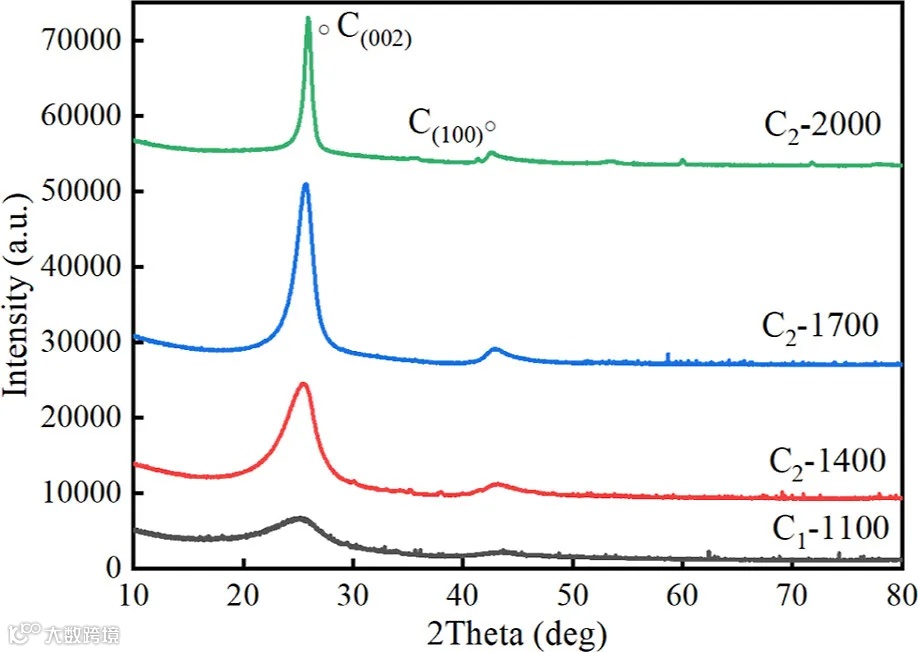 X射线衍射(XRD)和拉曼光谱分析表明,碳黑在高温下石墨化程度显著提升,有序结构增强。
