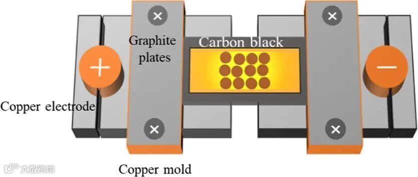 超快焦耳加热设备示意图展示了碳黑样品的处理流程,快速升温至目标温度并冷却后得到改性样品。