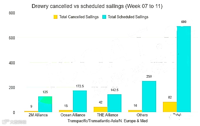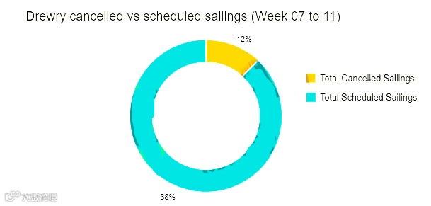 为应对需求不足,2023年前七周,集运公司在亚欧线削减了27%的运力。在跨太平洋、跨大西洋和亚洲至北欧和地中海的主要贸易航线的总共690个预定航次中,在第7周(2月13日至19日)到第11周(3月13日至19日)的5周间取消了82个航次,取消率占12%。