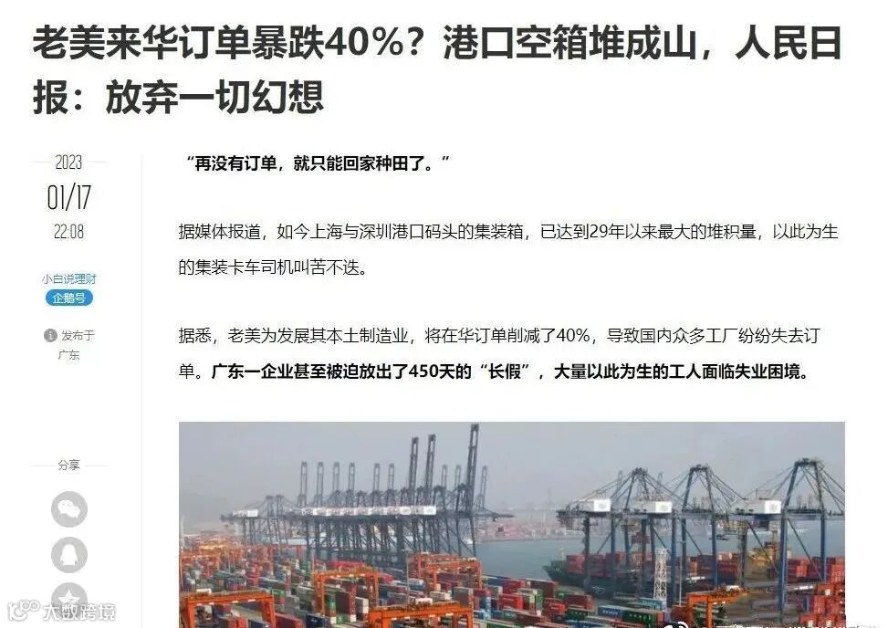根据中国海关总署披露的数据显示,2022年11月份我国对美出口暴跌25.4%。这一剧烈跌幅的背后是来自美国的制造业订单下滑了40%!广东一企业甚至被迫放出了450天的“长假”。