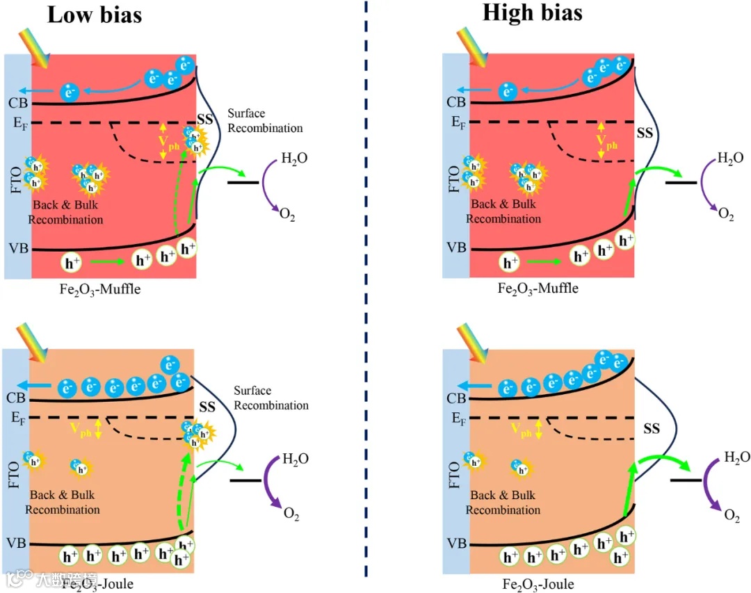 最后,图7 展示了赤铁矿光阳极在光照和不同偏压下光生电荷转移的动力学示意图,清晰地说明了Fe2O3-Joule光阳极由于表面态的正移,实现了更有效的表面电荷分离和转移。
