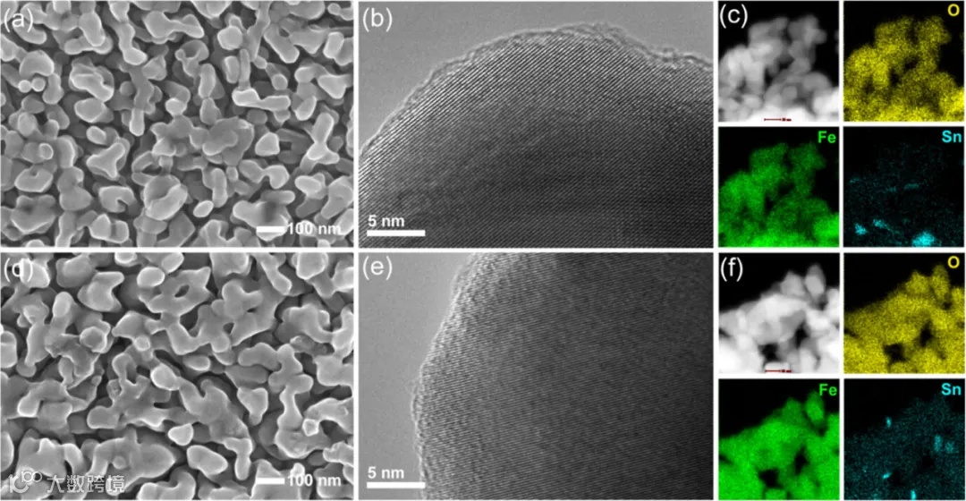 图3 通过扫描电子显微镜(SEM)、高分辨透射电子显微镜(HRTEM)和能量色散X射线光谱(EDX)元素映射,展示了光阳极的形貌、微观结构和元素分布,证明了所制备光阳极的高晶性和均匀性。