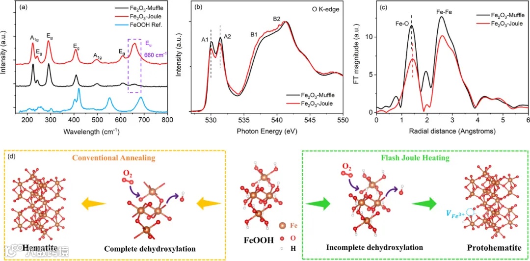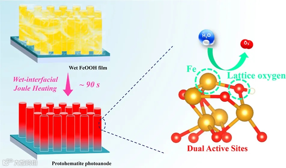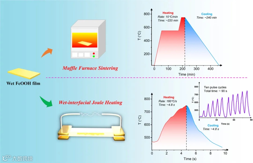 图1 展示了传统炉式退火与湿界面焦耳加热方法制备赤铁矿光阳极的示意图。传统方法耗时较长,而我们的技术通过瞬态高温和即时淬火过程,简化了制备步骤。