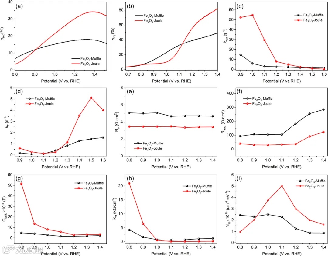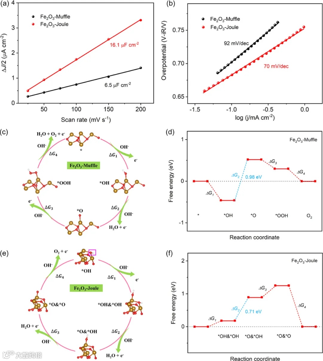 图5 进一步通过电化学双层电容(Cdl)和Tafel图,以及氧发生反应(OER)的自由能(ΔG)图,揭示了Fe2O3-Joule光阳极中OER动力学的加速机制。