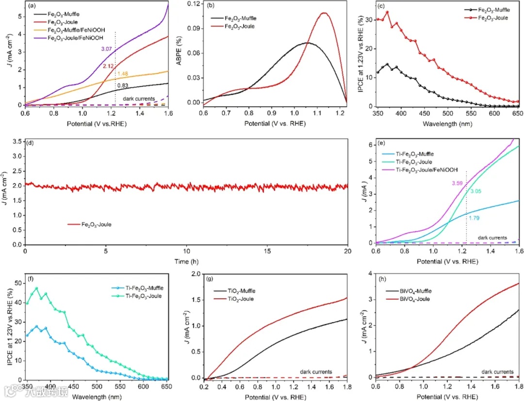 光阳极的光电解性能通过线性扫描伏安法(LSV)得到了评估。图4 展示了Fe2O3-Joule光阳极在1.23 V vs RHE下的最大光电流密度,达到了2.12 mA cm–2,这是通过传统退火过程制备的光阳极的2.5倍。此外,通过简便的电沉积过程负载了高效的FeNiOOH共催化剂,进一步提高了光阳极的性能。