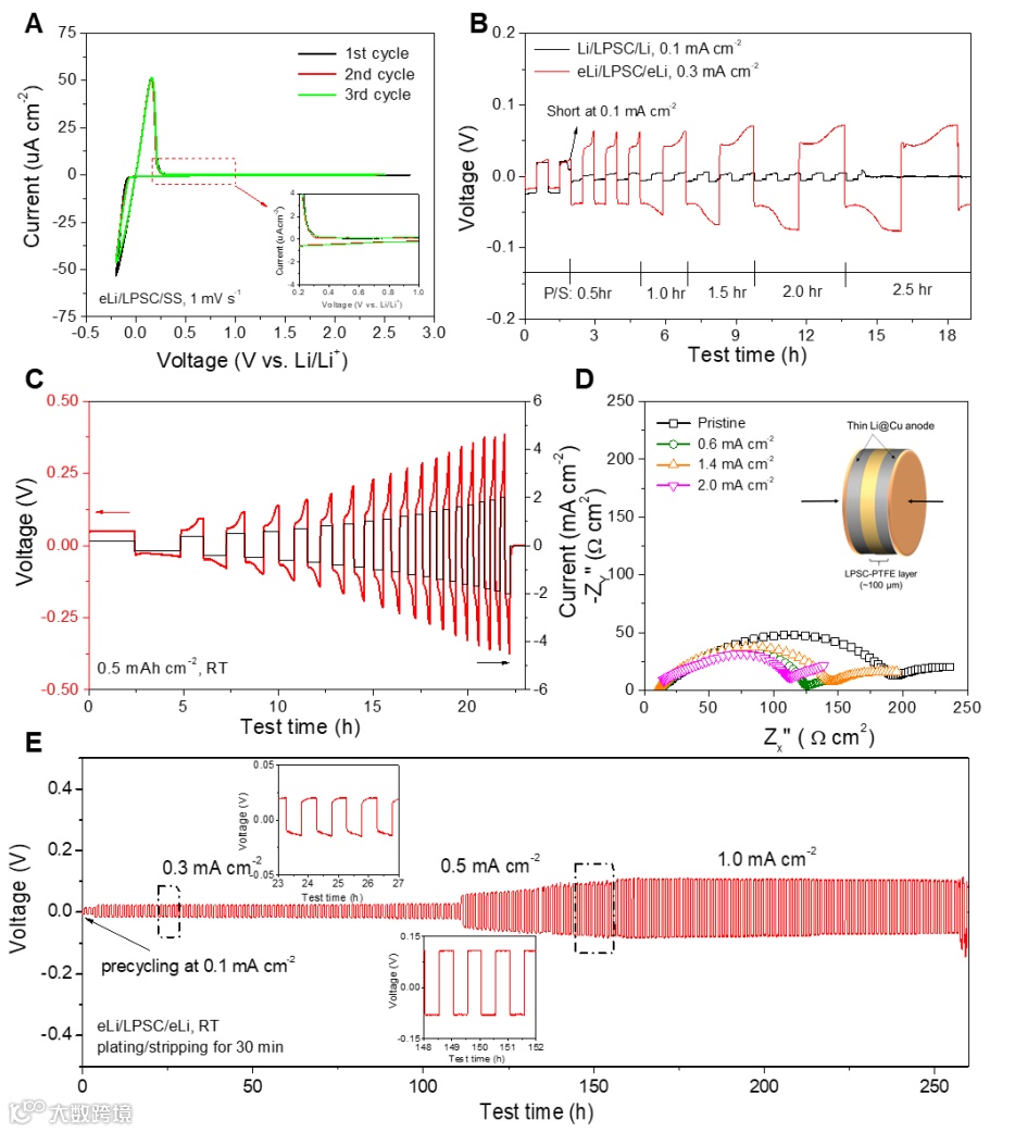 图3:展示了eLi负极与薄LPSC-0.5% PTFE电解质在室温下的电化学性能,包括循环伏安曲线、直流循环性能比较、电压曲线和EIS谱。
