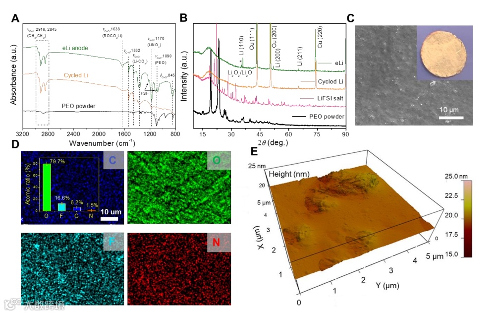 图2:揭示了设计的eLi负极的特征,包括FTIR图谱、XRD图谱、SEM图像、EDS映射和3D AFM图像,展示了CPI和SEI层的均匀涂覆和表面粗糙度。