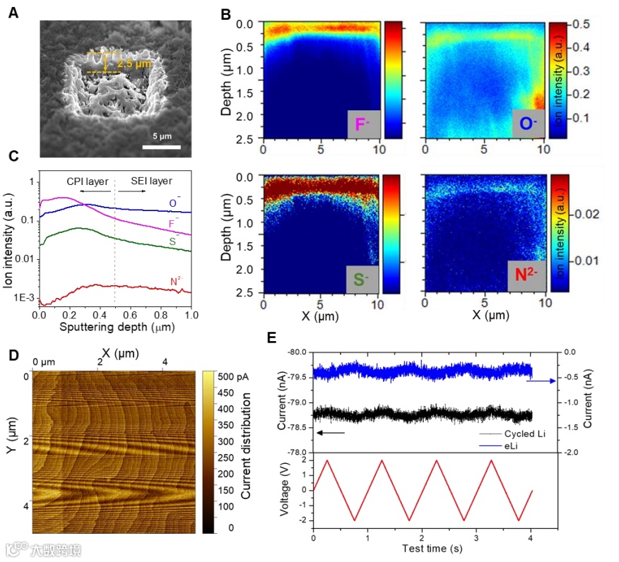 图4:揭示了eLi负极的材料分布和电子导电性,包括ToF-SIMS的顶层表面形貌、深度剖面、元素分布和C-AFM获得的电流分布图。