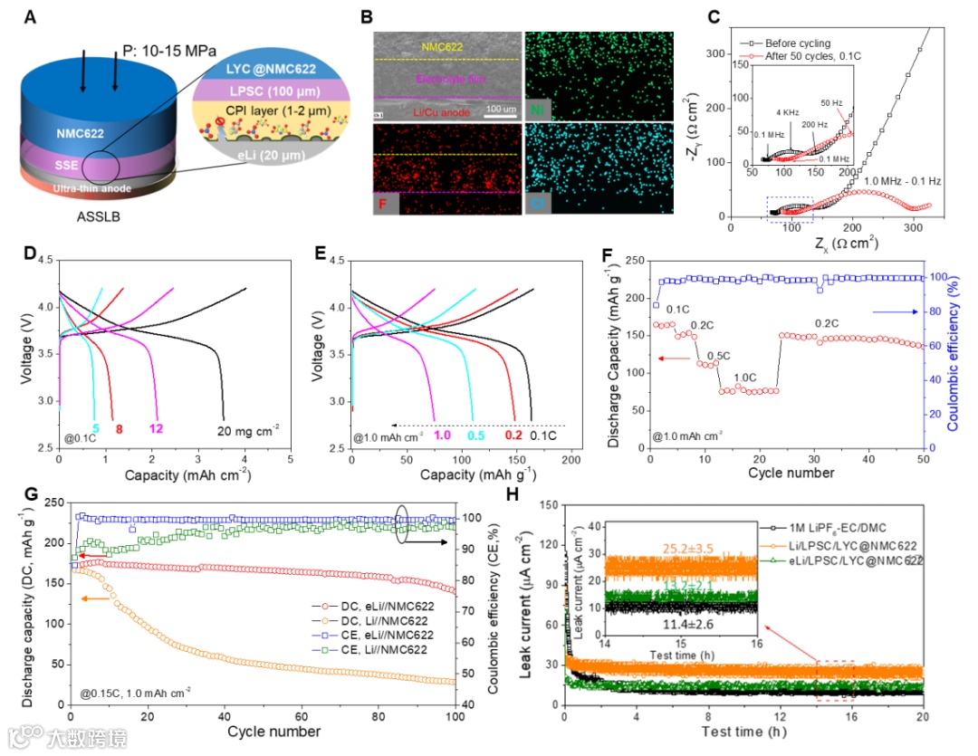 长期循环稳定性:与高镍LiNi0.6Mn0.2Co0.2O2(NMC622)正极配对的ASSLB展示了良好的倍率性能和长期循环稳定性(100个周期后保留81%),证明了工程化LMA设计的可行性。