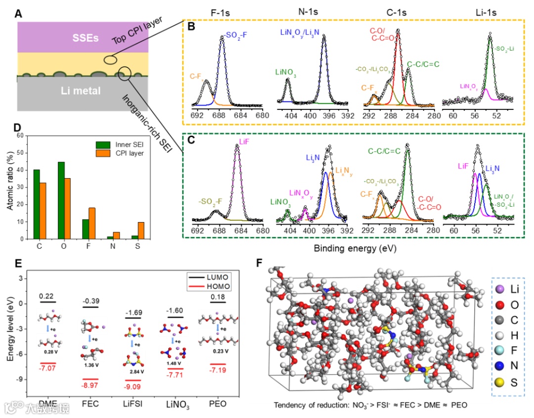图5:展示了eLi负极的SEI-CPI结构,由液体电解质的添加剂化学专门设计,包括示意图、高分辨率XPS谱和元素浓度比较。