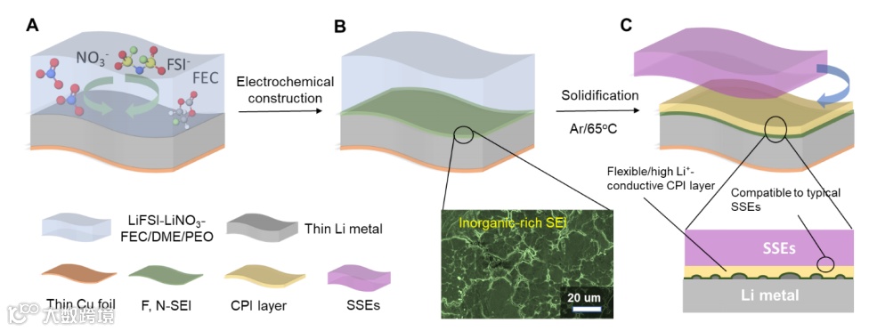 图1:展示了通过动态稳定性策略设计的eLi负极示意图,包括原位SEI构建和CPI层的形成,以及其对防止枝晶传播和确保与SSE良好接触的作用。