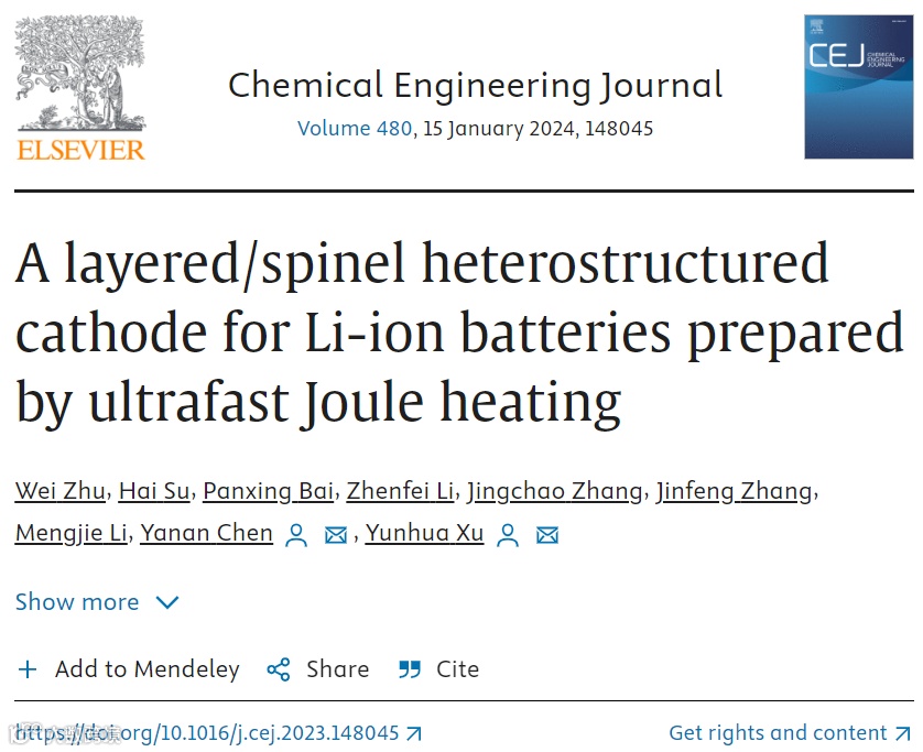 尖晶石LiMn2O4由于它的低成本、高放电电压(~4.0 V)以及非毒性等优点成为最有潜力的正极材料之一。然而,不可逆相变以及Mn溶解导致了其较差的循环性能。此外,传统制备方法长时间的热处理(通常数小时)导致其高的能量消耗以及制造成本。本文中,作者利用超快的焦耳热方法在数秒内合成了一种包含层状Li2MnO3与尖晶石LiMn2O4的异质结构正极材料。基于锂过量的前驱体,焦耳热方法的非平衡的属性促使了异质结构的超快形成。引入的层状Li2MnO3相可以作为结构稳定剂去抑制不可逆相变以及Mn溶解。因此,异质结构正极展示出优异的循环性能(5C倍率下循环800圈的容量保持率为83%)。