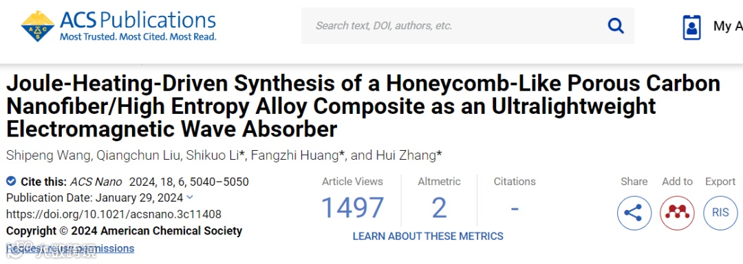 高频电磁技术的广泛应用促进了高效电磁波(EMW)吸收材料的研究和实现。复杂的电磁环境需要高效的电磁波吸收材料,其吸收能力强、厚度薄、重量轻、吸收频带宽。传统的金属基吸波体虽然在一定程度上表现出较高的磁损耗和较强的吸波能力,但密度高、稳定性差的缺点严重阻碍了其进一步发展。高熵材料 (HEM) 是一类具有高度组成复杂性的材料,其典型特征是存在接近等摩尔浓度的多种主要元素。由于高构型熵、晶格畸变、延迟扩散和鸡尾酒效应等特性,高熵吸收体在电磁波吸收领域引起了广泛关注。然而,它们的高密度和有限的化学稳定性阻碍了它们作为轻质吸收剂的进步。在此,本文利用静电纺丝和焦耳加热方法成功地将五元FeCoNiCuMn HEA集成到蜂窝状多孔碳纳米纤维(HCNF)中。利用固有的晶格畸变效应和蜂窝结构,HCNF/HEA复合材料在2wt%的超低填充量下表现出出色的电磁波吸收性能。它的反射损耗最小为-65.8dB,最大吸收带宽高达7.68GHz。这项研究不仅展示了 HCNF 与 HEA 结合的有效性,而且强调了焦耳热合成在开发轻质 HEA 基吸收剂方面的潜力。