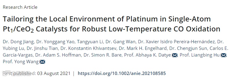 通过原子捕获(AT,空气中温度为800 ℃)的单原子Pt1/CeO2催化剂显示出优异的热稳定性,但是由于Pt2+在高度对称的正方形平面Pt1O4配位中的过度稳定,它在低温下对CO氧化不起作用。虽然还原活化形成铂纳米颗粒(NPs)可以提高活性,但是NPs易氧化,导致活性急剧降低。在此,本文报道了通过热冲击(TS)合成法对孤立Pt2+的局部环境进行调整,可以得到高活性和热稳定性的Pt1/CeO2催化剂,其在工业相关负载(1wt%)下具有抗氧化性和低温CO氧化反应性。