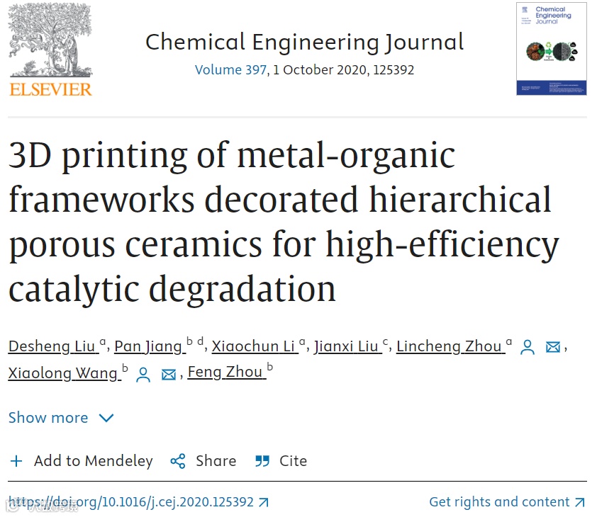 金属有机框架材料(MOFs,Metal-organic frameworks),因表面积高、孔结构可调控以及活性位点多等特点,已成为一种去除有机污染物的新型催化材料。但是,目前已报道的许多新型MOFs复合材料,因可加工性、水稳定性以及可回收性等问题,其大规模制备及可持续和工业化应用环境均不理想。基于此,本文研究人员结合3D打印技术在复杂器件构筑及自由设计、制造与成型等领域的优势,开展了3D打印MOFs修饰的多孔陶瓷催化材料与器件研究,用于水体有机污染物催化降解。研究人员首先研发了由磷酸铝溶胶(AP)、亲水性气相SiO2和聚苯乙烯微球(PS)组成的3D打印陶瓷墨水,其中PS微球用于调节3D打印陶瓷的孔隙度;然后,用墨水直书写(DIW)3D打印技术挤出成型,并经高温煅烧后获得高精度的三维多级多孔陶瓷骨架;最后,通过聚多巴胺表面修饰和水热法处理技术,在3D打印的多级多孔陶瓷骨架上原位生长MOFs颗粒,从而制备出具有结构可调性、高催化活性、长期稳定性以及易于器件化的MOFs修饰的3D打印多级多孔催化剂。