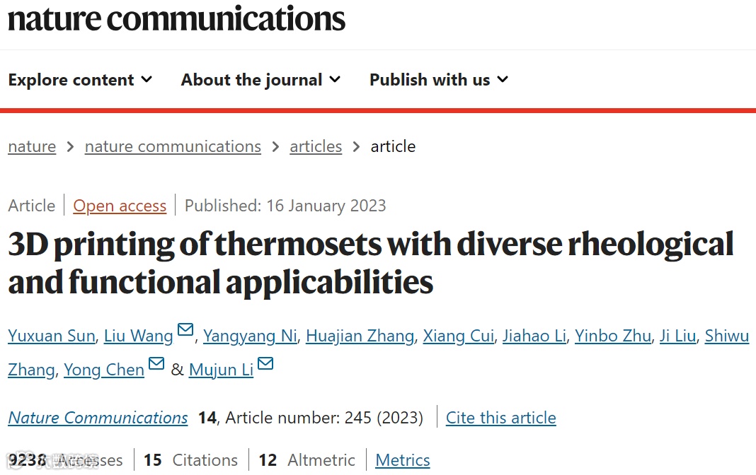 硅胶等热固性材料随处可见。然而,现有的热固性材料制造要么制造周期长(如反应注射成型),要么几何复杂性低(如铸造),或可加工材料有限(如前向聚合)。本文中,研究人员通过将焦耳加热器集成到打印头中,开发了一个3D打印平台,该平台能够对具有多种流变性和功能性的热固性进行墨水直写(DIW)打印。焦耳加热器提供高温环境,使固化油墨基材的顶面保持高温。当热固性油墨新鲜挤出和沉积时,其上下两面都被加热,导致原位双重加热启用的快速交联反应。