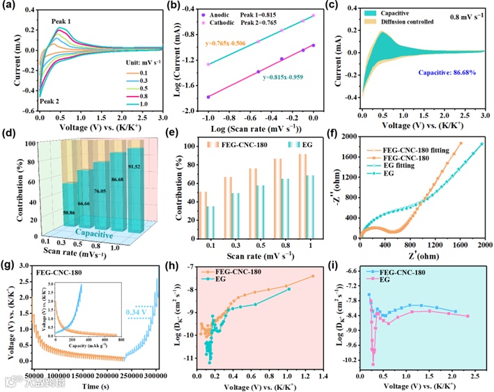 通过循环伏安法和电化学阻抗谱等手段,系统评价了FEG-CNC-180作为钾离子电池负极材料的动力学性能。循环伏安曲线结果显示,FEG-CNC-180在不同扫描速率下形状保持一致,仅峰值位置随速率增大有轻微偏移,表明其极化小,电导率高。通过对峰值电流与扫描速率关系的分析,FEG-CNC-180的氧化还原过程峰值分别为0.765和0.815,表明其钾储存主要通过伪电容方式实现。此外,在0.8mV/s下,FEG-CNC-180的电容性贡献率高达86.68%,明显高于EG,表明其电荷转移动力学优异。进一步研究结果显示,随着扫描速率的增加,FEG-CNC-180的电容性贡献率也逐步提高。同时,与EG相比,FEG-CNC-180在各扫描速率下电容性贡献都更高。这可能归因于其弯曲结构下形成的优良导电网络,有利于提高稳定性和电导率,促进钾离子快速储存。电化学阻抗结果也证实FEG-CNC-180在钾离子间质插散动力学方面优于EG。总体来看,FEG-CNC-180作为钾离子电池负极材料在电容性贡献、电导率和离子扩散动力学等方面均表现出优势。